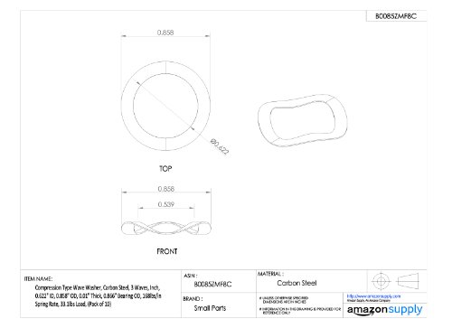 Compression Type Wave Washer, Carbon Steel, 3 Waves, Inch, 0.622" ID, 0.858" OD, 0.01" Thick, 0.866" Bearing OD, 168lbs/in Spring Rate, 33.1lbs Load, (Pack of 10)