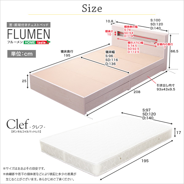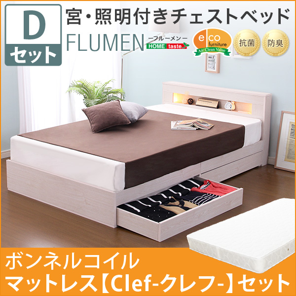 宮、照明付きチェストベッド【フルーメン-FLUMEN-(ダブル)】(ボンネルコイルスプリングマットレス付き)