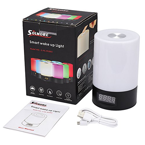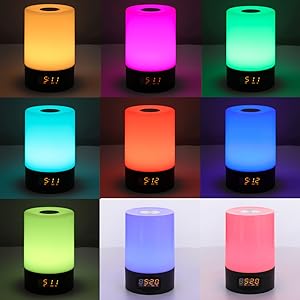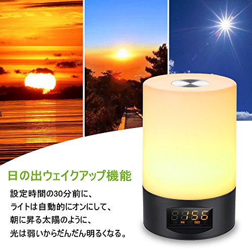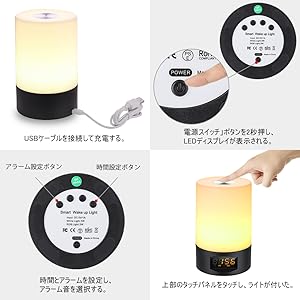 【綺麗なイルミネーションライト】 スタンバイモード或いは白色光モードで、「タッチパネル」を2秒押すと、カラー光モードになって、256色の光が自動的に変化します。 色は非常に華麗で、お気に入り色を見ると、「タッチパネルを」をショートタッチして色を選定できます。 「タッチパネル」を再びショートタッチし、色の自動変化に入って、タッチパネルを2秒押し、スタンバイモードに入ります。 場所にあわせてお好みな明るさと好きな色で設定できるナイトライトです。 ムード溢れる光が四方を満遍なく均一に照らすので柔らかな灯りを表現します。 | 【ご注意】 1.本製品を雨或は湿っぽい環境に置かないでください。 2.本製品を自分で分解、修理または改造しないでください。 3.認定された5V / 1Aアダプタープラグをご自分で購入してください。 4.製品が損傷しないように、本製品を投げたり、ぶつけたりしないでください。 5.バッテリー残量が極端に少ない場合は、ディスプレイが消灯し、充電する必要があります(約3秒間)。 6.設定されたアラーム時刻と現在の時刻の差が30分未満の場合は、起きてランプが点灯しませんが、アラーム音は正常に聞こえます。 7.充電なしでは、BATシンボルの点滅はバッテリが低(10%-15%未満)であることを示します。すぐに充電してください。そうでない場合は、通常のウェイクアップ機能に影響します。 | 【製品パラメータ】 電圧:5V 定格電力:3W 総重量:約400g 正味重量:約302g 材質:ABS + PC シェルの色:白+黒 充電時間:3〜4時間 リチウム電池容量:3600 mAH 製品サイズ:ca.9.8 * 9.8 * 15cm パッケージサイズ:ca.12.3 * 12.3 * 17.5cm 【パッケージ内容】 1×命令 1×USBケーブル 1×目覚ましライト |
