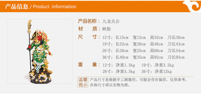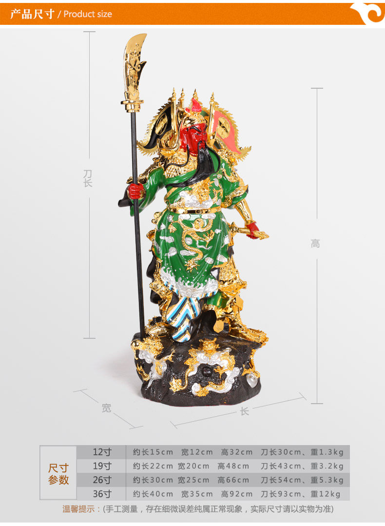 Material: resin Size: 12 inch paragraph: about 15cm long, wide 12cm, high 32cm, knife length 30cm, net weight 1.3KG 19 inch paragraph: About 22cm long, wide 20cm, high 48CM, knife length 43cm, net weight 3.2kg 26 inch paragraph: about 30cm long, wide 25cm, high 66cm, knife length 54cm, net weight 5.3kg 36 inch paragraph: About 40cm long, wide 35cm, high 92cm, knife length 93cm, net weight 12kg