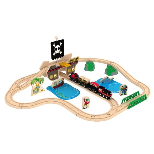-. Binding : Toy -. Brand : Toys R Us -. EAN : 0803516070396 -. Feature : Create original layouts with the 24 pieces of wooden track / Decorate the tracks with pirates, a palm tree with a treasure chest, two ocean playmats and a shark / Train engine and three cargo cars can tote the cannon, treasure chest and barrels / Go under or over the pirate ship bridge / Pirate ship features a walking plank and fabric sail -. IsAdultProduct : 0 -. Label : Toys R Us -. Manufacturer : Toys R Us -. MPN : 5F61091 -. PartNumber : 5F61091 -. ProductGroup : Toy -. ProductTypeName : TOYS_AND_GAMES -. Publisher : Toys R Us -. Studio : Toys R Us -. Title : Imaginarium Pirates Bay Treasure Train Set -. UPC : 803516070396