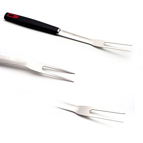 - 【EXCEPTIONAL QUALITY】-- As soon you remove these deluxe tools from the gift box quality packaging, you'll immediately notice the perfect heft and comfortable contoured rubber grips. The fork and spatula are each made of a single long piece of beautifully brushed stainless steel, while the tongs consist of 2 pieces joined together at a spring loaded hinge.