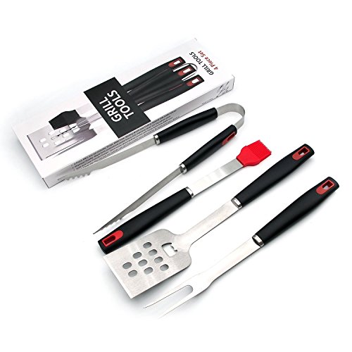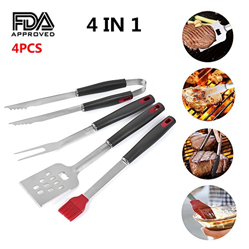 - 【COMPLETE SET & PREMIUM MATERIALS】-- 4-Piece Grill Tools includes tongs, barbecue meat fork, silicone basting brush, and grilling spatula that features a bottle opener for camping and backyard parties. Made from professional grade heavy duty stainless-steel with long non-slip plastic grips.