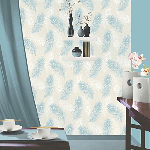 -. Feature : A beautiful feather themed wallpaper / Ideal for bedrooms and lounges / 10.05m (32.11ft) long x 52cm (20.5in) wide / 64cm pattern repeat / Colour: Teal / Cream