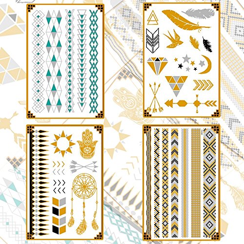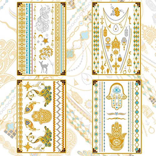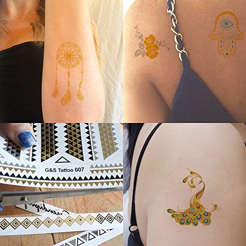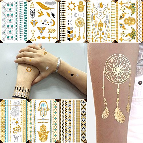 Temporary Tattoos, 8 Sheets Gold Silver Metallic Temporary Tattoos Glitter Tattoo Designs Jewelry Tattoos, 100+ Color Flash Fake Waterproof Temp Tattoo Stickers