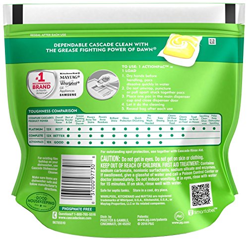 Product DescriptionCascade Complete ActionPacs power away stuck-on messes, which means you can skip the prewash and still get a complete clean0