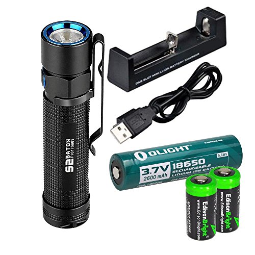 Olight S2 Baton 950 Lumen CREE LED Flashlight with olight 18650 rechargeable 18650 lithium-ion battery, charger and two EdisonBright CR123A Lithium Batteries bundle