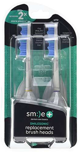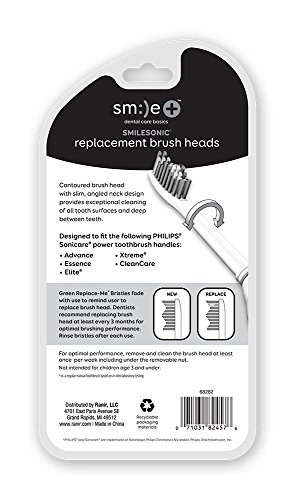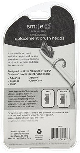 ReleaseDate : 2015-09-14 Studio : Ranir Publisher : Ranir Binding : Health and Beauty Product Description Compare to PHILIPS Sonic are e Series replacement brush heads at a GREAT Value! Designed to fit PHILIPS Sonic are Advance, Essence, Elite, Extreme, and Clean Care power toothbrush handles. Smile Smile Sonic replacement brush heads are comfortable to use and leave the mouth feeling clean and fresh. Contoured brush head with slim, angled neck design provides exceptional cleaning of all tooth surfaces and deep between teeth. Removes over 50% more plaque deep between teeth than a manual toothbrush. Removes 2X more plaque along the gum line than a manual toothbrush. Green Replace-Me bristles fade with use to remind user to replace brush head. Dentists recommend replacing brush head at least every 3 months for optimal brushing performance. Package includes four replacement brush heads and covers. Phillips and Sonic are trademarks of Koninklijke Philips Electronics NV and/or Philips Oral Healthcare, Inc.'s. a regular manual toothbrush based on in vitro laboratory testing. 0