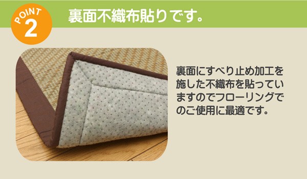 クッション性にこだわったイ草カーペットです。クッション性、耐圧分散性に優れた硬質チップウレタンをイ草と不織布でサンドしました。プニプニといして柔らかく、裏には不織布を貼っていますのでフローリングのお部屋でのご使用に最適です。遮音特級LL35を取得しており、床下への騒音を軽減する効果もあります。ホットカーペットカバーとしても使用できます。い草に青森ヒバ加工を施しています。(抗菌、防臭効果)