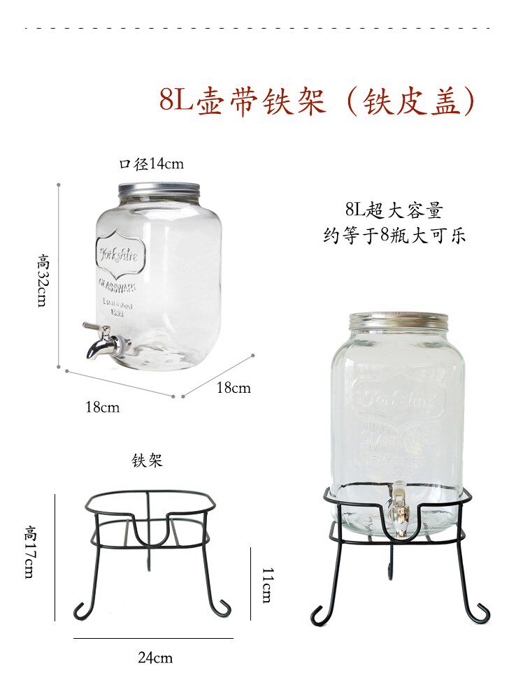 铁皮套装:玻璃壶尺寸:直径18cm 高 30cm 套净重: 2.8 KG 容积:5.5 L 配上底座 总高 45厘米黑铁架大套装:玻璃壶尺寸:直径18cm 高 30cm 套净重: 2.85 KG 容积:5.5 L 配上底座 总高 47厘米黑铁架中套装:玻璃壶尺寸:直径15cm 高 26cm 套净重: 1.71 KG 容积:3.6 L 配上底座 总高 41厘米
