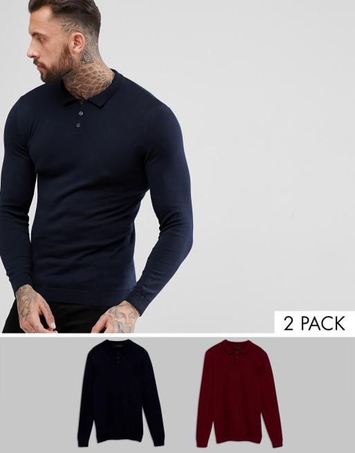 ASOS 2 Pack Knitted Muscle Fit Polo In Navy/Burgundy SAVE