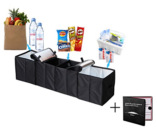 -. Feature : COLLAPSIBLE and PORTABLE: Foldable and portable trunk organizer great for groceries, travel accessories, storing tools, maps, cleaning supplies, bottles, emergency tools and much more... / TWO COOLER SET: Two Aluminum foil refrigerator compartments with zippers are specially designed for frozen food storage, Great for unplanned cold or frozen items from grocery store. / COMPARTMENTALIZED DESIGNED: Compartmentalized car organizer, keep your groceries or other accessories in place, you no longer need to worry about your groceries or travel accessories slipping and sliding in your car, keep your car clean and tidy. Its made by oxford cloth, good construction, folds easily and takes no space when not use. / Free Car insurance holders: Perfect for keeping important automobile information readily available, this Auto Registration and Insurance Case features a black vinyl car document wallet with cover auto and writing in gold. / Dear Customer, the main feature of this trunk organizer is to keep frozen or warm food and drinks at perfect temperature, If you put some ice in it, the effect will be much better, but we are afraid the ice need to be wrapped, for it is not leakproof. Enjoy your shopping. :)