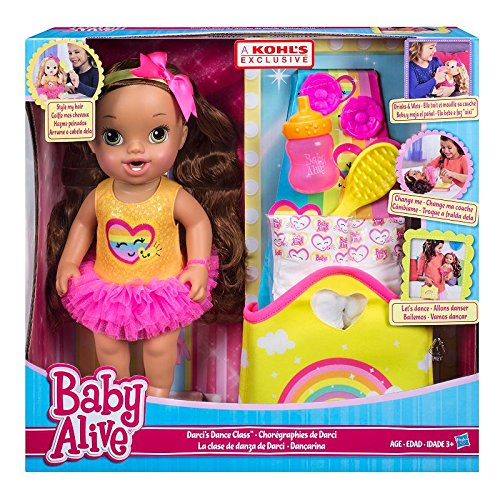-. Feature : It's time for dance class, and your little girl will love taking her Baby Alive doll there / Darci is ready for class / She sometimes needs a change after she drinks, but fortunately her bag opens to a changing mat / Doll drinks & wets / Includes: Doll, Outfit, Brush, Bottle, 2 diapers, 2 barrettes, Headband, Convertible dance bag