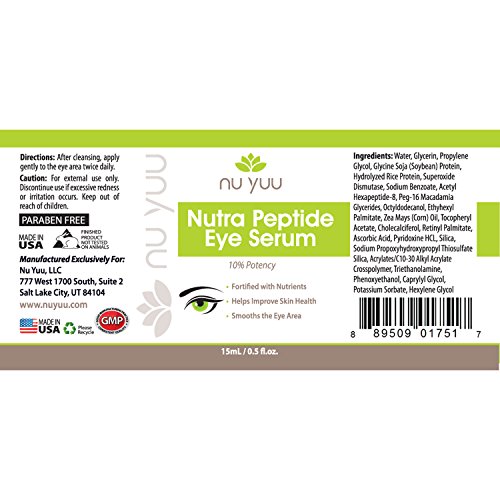 - Feature : Get younger, healthier skin with Nu Yuu Eye Serum. Helps improve skin health and smooths the eye area / Fortified with nutrients to reduce puffiness, wrinkles, bags, dark circles and fine lines / For best results, use after cleansing, apply gently to the eye area twice daily / Third party tested and certified for purity and safety. Paraben free, never tested on animals. 15mL / 0.5 fl. Oz. / Nu Yuu Nutra Peptide Eye Serum is made in the USA and in accordance with the highest standards of our GMP certified facility