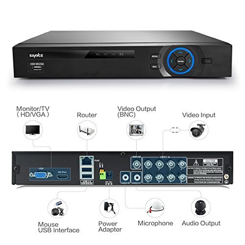 -. Feature : ANNKE "8CH DVR w/ 4 cameras kit" is superior to a "4CH DVR w/ 4 cameras", it provides you the flexibility to extend additional cameras without additional DVR purchased when needed in future. Amazing 4-in-1 DVR which supports Analog, HD-TVI, CVBS and IPC, exceptional 500m zero-delay coaxial transmission to make sure the real-time video signal. / Newest 8 channel 1080p lite H.264+ DVR with 720p indoor/ outdoor cameras for true day and night monitoring with 66ft IR range. Note:If you need more security cameras, please search ASIN ON AMAZON: B0169YE894 / Get set up quickly and easily: You could scan the QR code via mobile device using our free Annke View app (available on iOS/Android). Say bye-bye to traditional, complex setup processes that require you to have a degree in networking. It can be quickly and easily setup by anyone. Instantly see live video using your computer, tablet, or phone from anywhere. / Intelligent motion detection email alert with images, dual-stream design to separate local recording and remote viewing. Smart playback available with customizable searching area, playback time is greatly reduced by speeding through unimportant videos / Its preinstalled 1TB hard drive will provide continually footage recording in real time. All SANNCE & ANNKE products have passed ISO 9001 certified and HDMI Senior Member certified. All systems CE & FCC certified with qualified power supplies. No harmful interference is produced by the device.