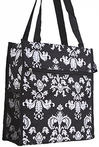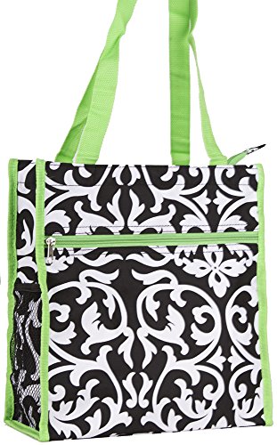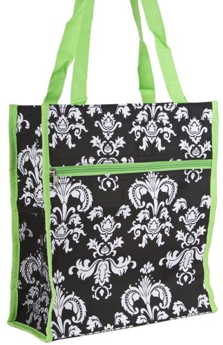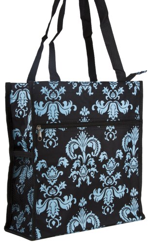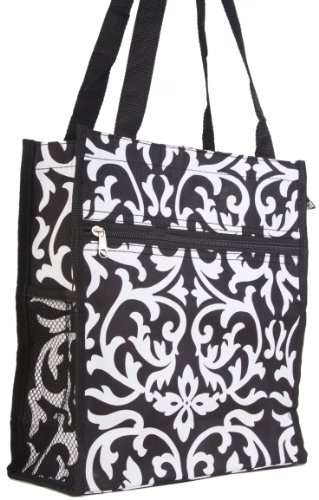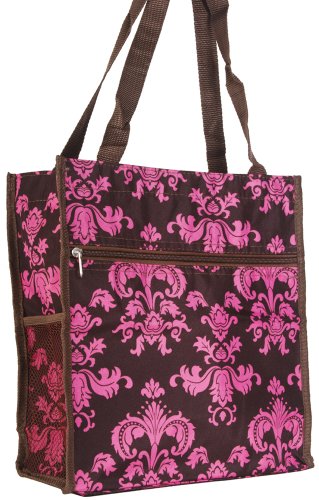 Looking for the perfect multi-purpose tote bag? Look no more! Made out of a strong microfiber material, this multi-purpose bag can handle whatever you throw in it. This lightweight versatile tote is an ideal and fashionable choice for a reusable grocery bag, school bag, or beach bag to throw over your shoulder and go! Exterior velcro, zipper, and mesh pockets make for easy and accessible organization and a durable nylon lining makes for easy cleanup of accidental spills. Features a zip top as well as a Velcro closure for extra security. In a fun damask print, this perfect shopping bag is sure to get you noticed and comes with a matching coin purse too!