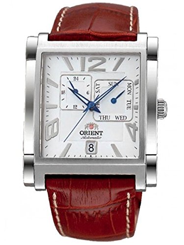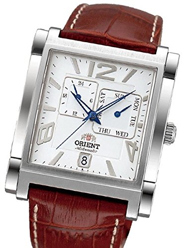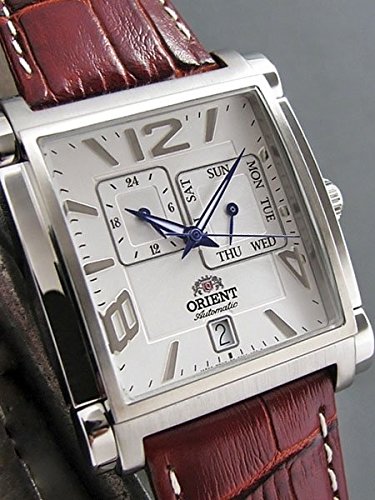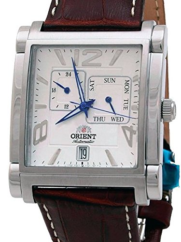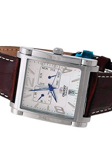 Studio : Orient Publisher : Orient Binding : Watch Product Description The Orient Galant model ETAC005W offers a unique combination of classic and modern design elements. The brown genuine leather band and classic white face make it a timeless option perfect for the office or formal occasions, while the blue features on the dial and the unique case shape give it a fun, modern twist. The watch is powered by an ORIENT Cal. 46B40 automatic movement that winds with the movement of your wrist. It has a 40 hour power reserve when fully wound. The white dial features a 24-hour sub-dial (military time) and a day sub-dial. Date is shown at 6:00. The stainless steel case measures 35.7mm x 44mm and it is 12.1mm thick. Features Movement: ORIENT Cal. 46B40 Automatic (self-winding) Case: Stainless steel, 35.7mm x 44mm and it is 12.1mm thick. Back: Solid snap-on back Crystal: Mineral Band: Brown alligator grain leather. Water Resistant: 50 meters Warranty: 1 Year 0