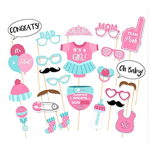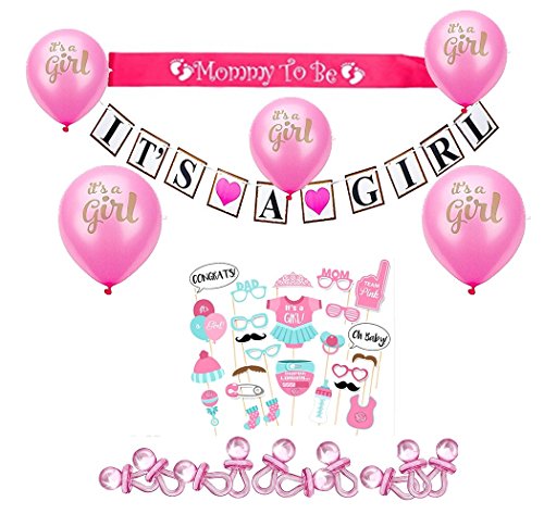 - SET INCLUDES: One piece Pink "mummy to be" sash, 20 pcs large acrylic pacifiers, 3 meters long "It's a Girl" banner that's easy to hang, 10 pcs 10 inches "It's a Girl" balloons, and 25 pcs of baby photo booth props for all your selfie needs.