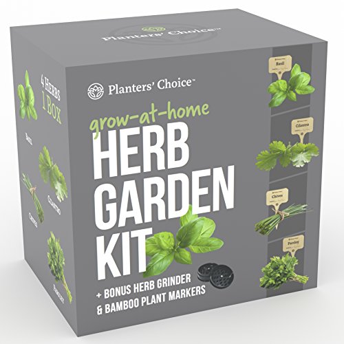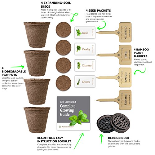 Planters' Choice Organic Herb Growing Kit + Herb Grinder - Complete Kit to Easily Grow 4 Herbs from Seed (Basil, Cilantro, Chives & Parsley) with Comprehensive Guide | Unique Gift