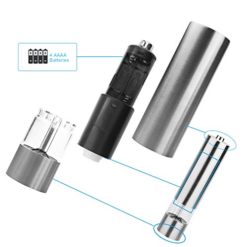 Specifications Material:?Stainless steel, ABS, acrylic, ceramic grinding core Color: Silver Power: 4 * AA Batteries (not included) Item Dimensions: 21cm*5.2*5.2 cm (8.3*2.05*2.05 inch) Suitable: mill pepper, corn, mustard seed and other small sized spices Feature Make from high quality 18/8 stainless steel and durable ceramic griding core, not rust. One Handed Operation and build-in light illuminates as it grinds so you can easily see what you are doing With a screw at the bottom to adjust the finesse / coarseness of the outing pepper. Perfect for both home and restaurants use. Operation Open: grip the upper part and turn right, it will open; turn left then it closes. Add: take out the motor shaft and add pepper into the grinder. Battery: 4 * AA batteries (not included). Install: aim at the small copper pieces then put the motor shaft into the grinder case. Adjust: on the bottom, adjust the powder thickness by rotating the rotary knob. Grind: press the button on the top(the light at the bottom turns on automatically when grinding.) Package: 2PCS Pepper Mill NOTE: Spice not included and Batteries not included. Uses 4 AA-sized batteries (not included).
