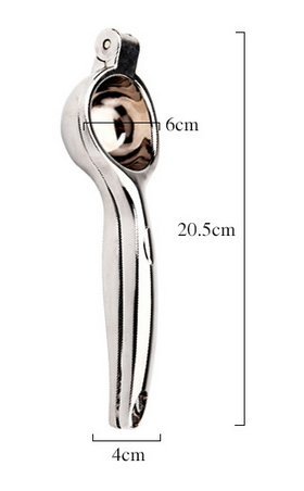 -. Feature : Made from 100% high-quality stainless which gives it a long life and prevents rusting, anti-corrosive and durable use with strong handle / Simply cut the lemon in half and place it cut-side down in the bottom bowl of squeezer, and squeeze the handle. / It can be used by kids, old men effortlessly. It can be used to get juice out of lemons, limes or blood oranges as well. / This solid and strong stainless steel manual lemon press juicer has large bowl to handle large size lemon and lime, even small oranges. / Material: Zinc alloy; Size:20.5 X 6 X 4CM
