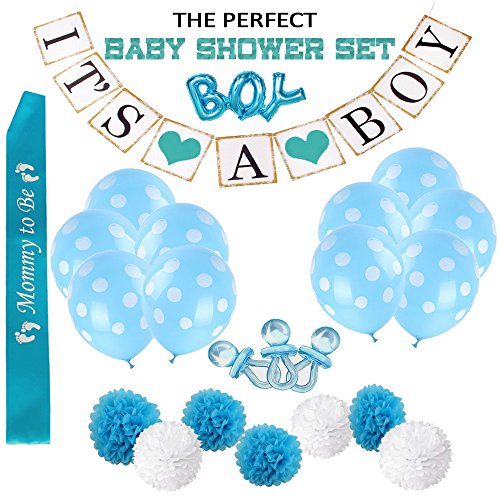 - 30 Piece Set Includes: 1 “It’s A Boy” Banner, 1 A Mommy to be sash, 1 Big “BOY” Foil Balloon, 7 Pom-Poms 4 blue & 3 White, 10 Polka Dot Balloons & 10 Mini Acrylic Baby Pacifiers.