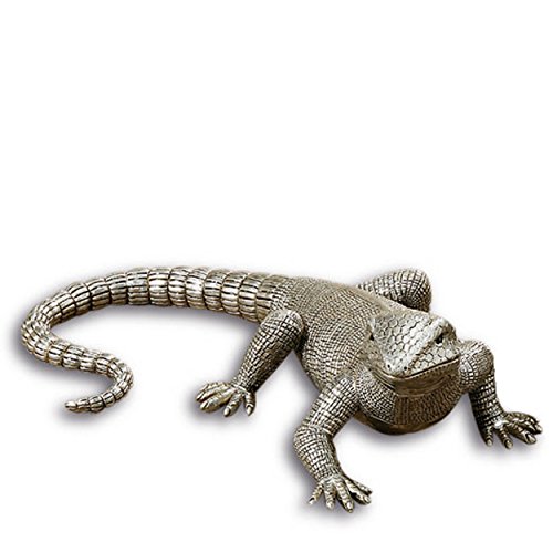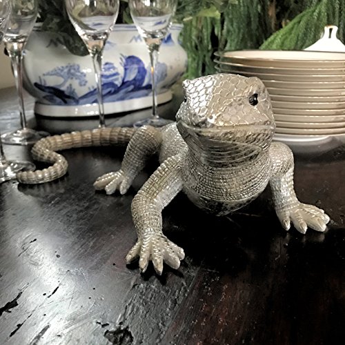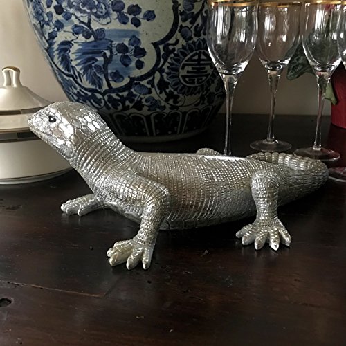 - A TROPICAL ACCENT PIECE this exuberant lizard is beautifully hand crafted and detailed, from its attentive eyes, smiling mouth and intricately detailed scales. Made of cast poly resin and painted silver, it is water resistant but not frost proof.