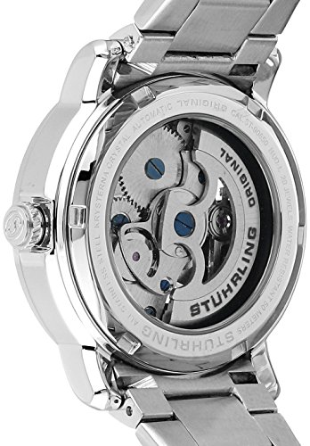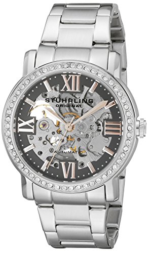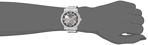 Polished stainless steel watch featuring Swarovski crystal-accented bezel and skeleton dial with rose-tone applied markers