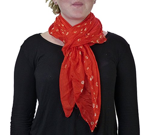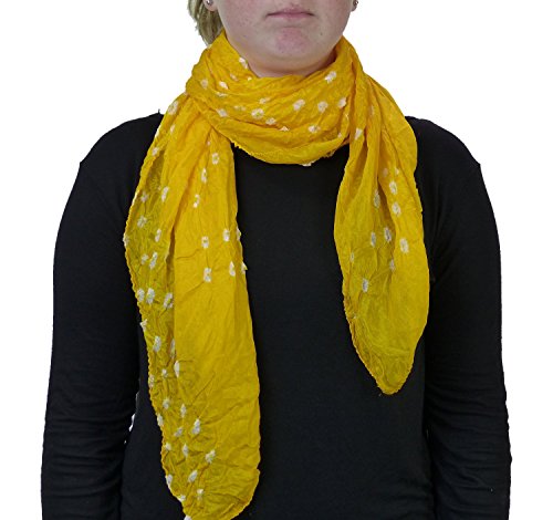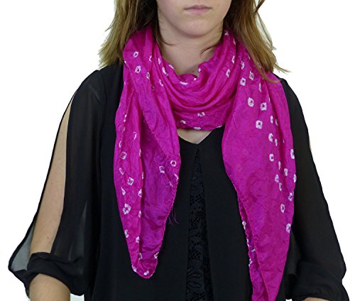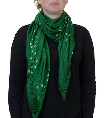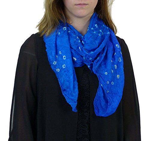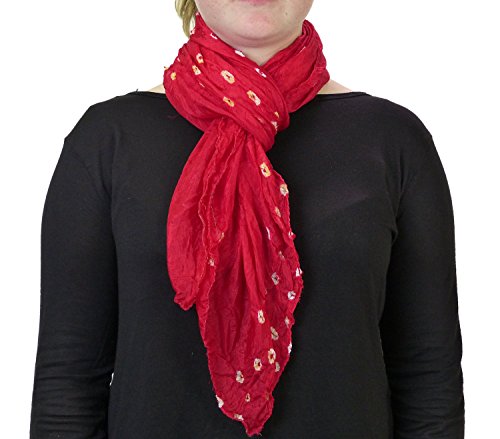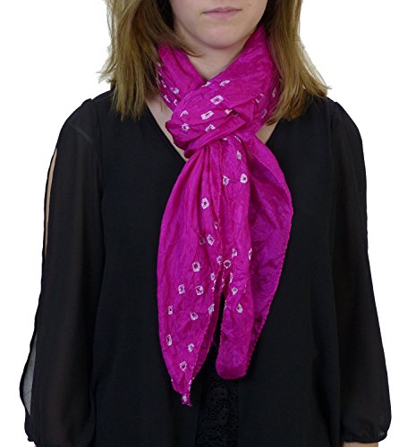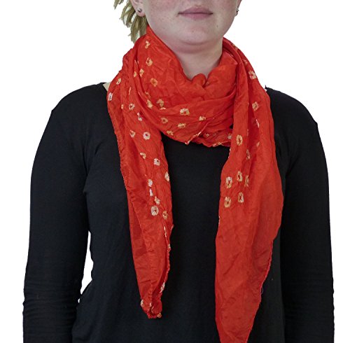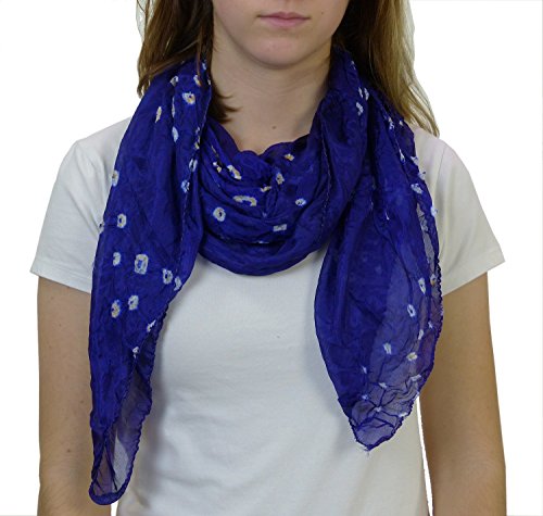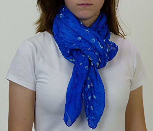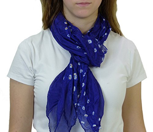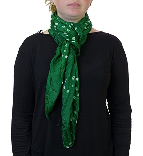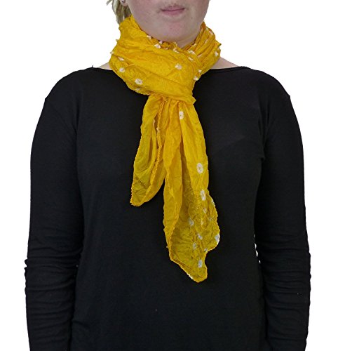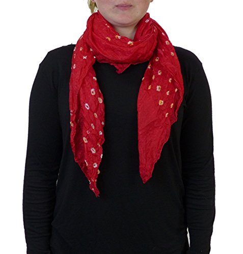 Binding : Apparel Product Description This exquisite handmade scarf or neckerchief is a one-of-a-kind accessory made of a silky polyester-rayon blend, a.k.a. art silk. The solid color dye is interspersed with tie-dye dots; available in 11 different colors. Packaged in an attractive, cylindrical bentwood box, which makes it an ideal gift item. Each scarf is entirely handmade. The fabric is first created on a hand loom and then hand printed by artisans, which may cause some minor irregularities in weave or print. These elements make each scarf unique and add to its beauty. The artisans of "The Silken Route" are thankful for your support. Care instructions: Due to the delicate nature of this fabric, please follow these instructions to maintain and extend the life of your scarf: - Do not pull the open-ended threads, instead, cut them off