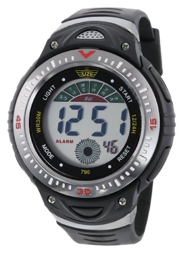 -. Binding : Watch -. Brand : Uzi -. Color : Black -. Department : mens -. EAN : 0024718926384 -. Feature : Tell the time in the dark by using the backlight / Easy to read digital display with standard or military time setting / Date display with an adjustable alarm / Water resistant up to 30-meters (90-feet) / Comes with a 1-year limited warranty / Backlight feature is brighter than other brands to tell the time in the dark / Wrist watch is finished in black; comes with a 1-year limited warranty / Water resistant to 99 feet (30 M): withstands rain and splashes of water, but not showering or submersion -. Label : Uzi -. Manufacturer : Uzi -. Model : UZI-W-796 -. MPN : UZI-W-796 -. NumberOfItems : 1 -. PackageQuantity : 1 -. PartNumber : UZI-W-796 -. ProductGroup : Watch -. ProductTypeName : WATCH -. Publisher : Uzi -. ReleaseDate : 2013-09-27 -. Studio : Uzi -. Title : UZI UZI-W-796 Digital Sports Series Watch with Black Rubber Strap -. UPC : 024718926384