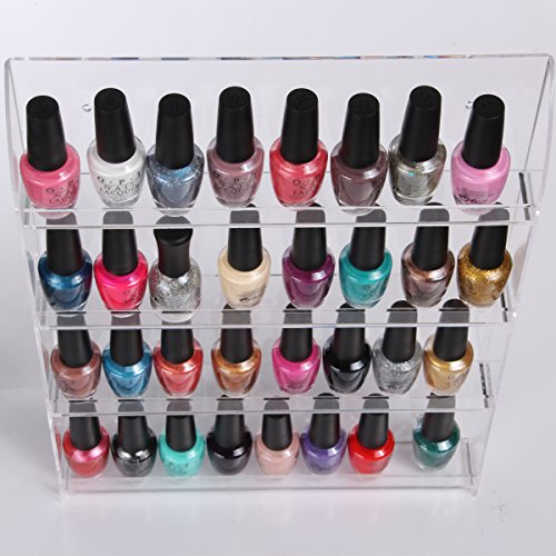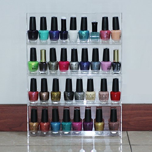SPACE SAVER: The nail polish holder rack has 4 shelves with a lip in the front so that your stuff will not fall of. With 12 inches length it fits approx 8-9 standard size bottles each shelf (according to bottles sizes), total fits 32-36 Bottles, makes your drawer and linen closet less cluttered.