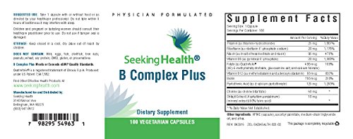 -. Binding : Health and Beauty -. Brand : Seeking Health -. EAN : 0828054134416 -. Feature : Provides bioavailable, well-tolerated forms of B complex vitamins and cofactors choline and shilajit extract per capsule. / IMPORTANT: B Complex Plus is manufactured for and sold exclusively by Seeking Health. We DO NOT recommend purchasing this product from any supplier other than Seeking Health on Amazon.com. / B complex vitamins are required for optimal health, particularly for healthy nervous system function. / B Complex Plus contains no dairy, eggs, fish, shellfish, tree nuts, peanuts, soy protein, wheat/gluten, GMO, artificial colors, flavors, or preservatives. -. Label : Seeking Health -. Manufacturer : Seeking Health -. Model : 023-05-001-20 -. MPN : 023-05-001-20 -. NumberOfItems : 1 -. PartNumber : 023-05-001-20 -. ProductGroup : Health and Beauty -. ProductTypeName : HEALTH_PERSONAL_CARE -. Publisher : Seeking Health -. Studio : Seeking Health -. Title : B Complex Plus | Bioavailable, Well-Tolerated Forms Of B Complex Vitamins | 100 Easy-To-Swallow Vegetarian Capsules | Physician Formulated | Seeking Health -. UPC : 798295549631