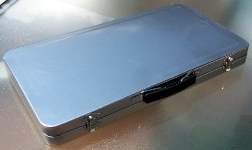 Tin storage case measures 14.5" wide x 7.75" high x 1.5" thick and includes 2 latch closures and carrying handle.