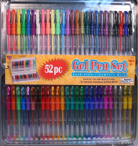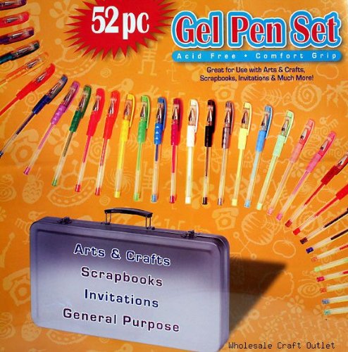 This incredible assortment includes 52 brand new Gel Pens packed in a tin storage case with 2 organizer trays inside to keep everything neat. This set gives you all the colors you could ever need in one convenient package! These pens write beautifully with smooth, consistent ink flow and exhibit the qualities found in pens twice the price. Tin storage case measures 14.5" wide x 7.75" high x 1.5" thick and includes 2 latch closures and carrying handle. This set includes: Glitter Pens, Neon Pens, and Metallic PensAcid-Free, 1.0mm tips, Comfort Grip Handles.Feature