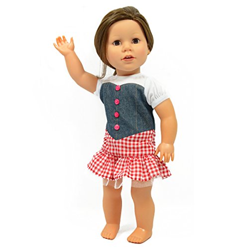 Dolls can let their equestrian skills shine in this snappy outfit! It is a neat country girl dress with pink buttons,white gathered sleeves in a super soft fabric, denim midriff, and a gingham flared skirt edged off with a piece of tulle. Doll outfit will transform dolly into a country girl instantly, as it looks so real!