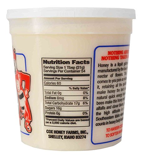 -. Feature : 100% PURE, RAW, AND NATURAL HONEY as made by the honeybees from the flower nectar they gather, transform and store in honeycombs / QUALITY CLOVER HONEY. Cox's Honey comes from the very best high mountain clover. It is perfectly mild and great-tasting. It is PURE clover honey and is the best honey on the market / IDAHO HONEY. Our honey is grown in or near Southeastern Idaho. Our honey comes to you as pure as nature made it, retaining all the delicate vitamins, minerals, and enzymes that make pure honey one of the greatest foods known to man / NO INGREDIENTS ARE ADDED BY MAN