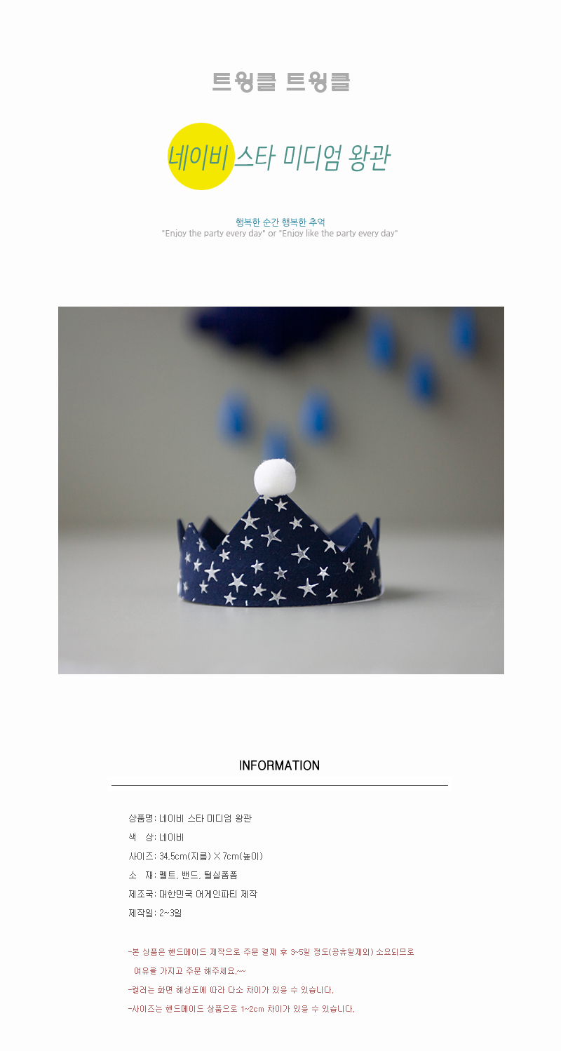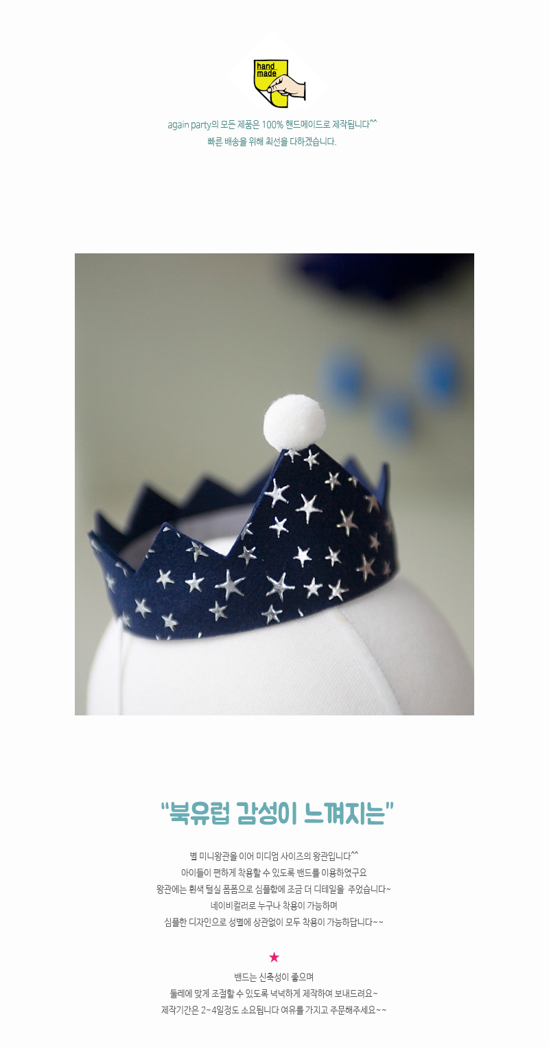 "어게인파티 제품의 모든 상품은 100% 핸드메이드로 제작되는 제품입니다. 주문완료후 3~5일 정도의 배송기간이 소요됩니다.(공휴일 제외) 주문완료후 3시간 후의 주문건은 취소되지 않는 점 꼭 참고해주세요 (핸드메이드 특성상 작업이 들어간 제품은 취소가 불가능합니다.)"