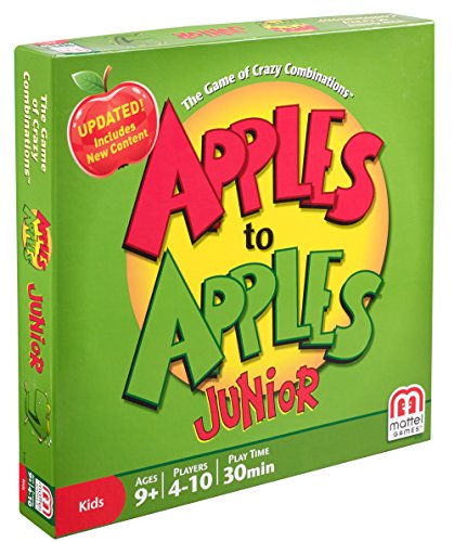 -. Binding : Toy -. Brand : Mattel -. EAN : 0653569442417 -. Feature : High Quality / Proprietary design / Exceptional performance / Apples to Apples is a game of hilarious comparisons / Contains 576 cards and provides hours and hours of fun / Players will delight in the crazy comparisons while expanding their vocabulary and thinking skills / Does not contain duplicate card sets / Good for hours of fun -. Format : CD-ROM -. Genre : party -. IsAdultProduct : 0 -. IsAutographed : 0 -. IsMemorabilia : 0 -. ItemPartNumber : N1387 -. Label : Mattel Games -. LegalDisclaimer : choking_hazard_contains_a_marble -. Manufacturer : Mattel Games -. Model : N1387 -. MPN : N1387 -. NumberOfItems : 1 -. OperatingSystem : N/A -. PackageQuantity : 1 -. PartNumber : N1387 -. ProductGroup : Toy -. ProductTypeName : TOYS_AND_GAMES -. Publisher : Mattel Games -. ReleaseDate : 2007-12-10 -. Studio : Mattel Games -. Title : Apples to Apples Junior - The Game of Crazy Combinations! -. UPC : 699687138887 -. Warranty : Y