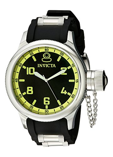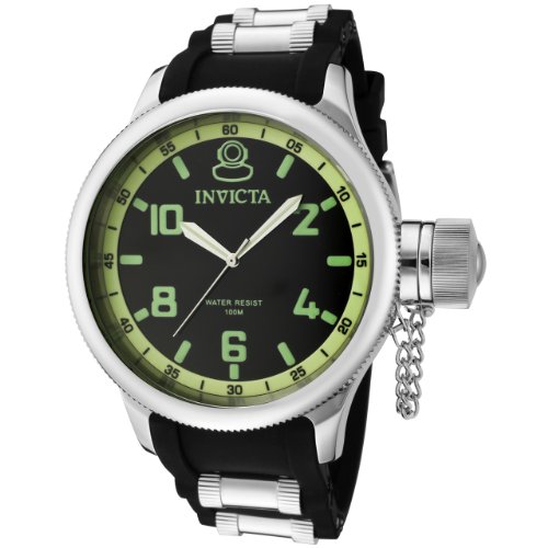 With a bold face and a decidedly masculine design, the Invicta Men's Russian Diver Black Dial Rubber Watch is functional and fashionable. Its presentation begins with a polished stainless steel case and bezel, which features a textured grip on its sides. It also offers a stainless steel crown with a secured screw-down cap. These stainless steel elements frame a black dial with silver-toned luminous hands powered by reliable Swiss quartz movement. The dial also offers green Arabic numerals and hour markers, along with black second markers every five seconds along a green inner bezel, which are all protected under a mineral crystal. The round stainless steel watch case blends into a black rubber bracelet, which features stainless steel barrel inserts for additional style and detail. This timepiece utilizes a trusty buckle clasp to secure the watch to your wrist and boasts water resistance up to 330 feet.Feature