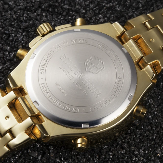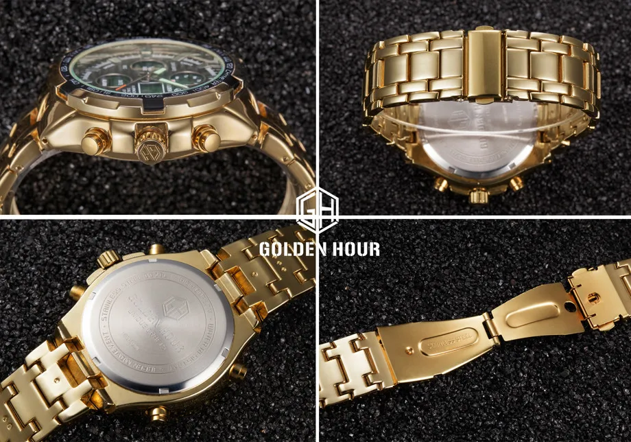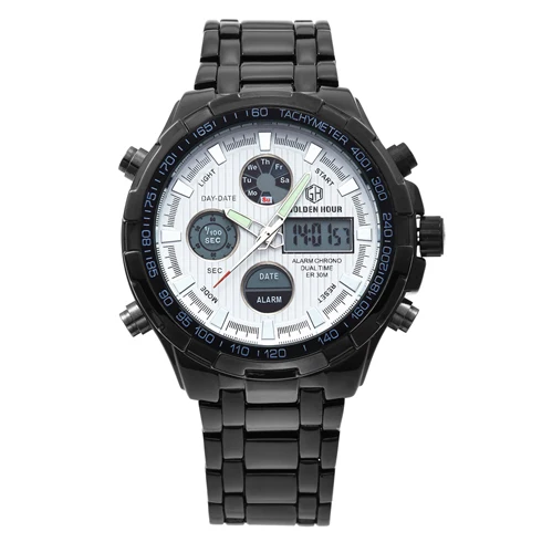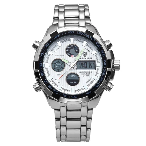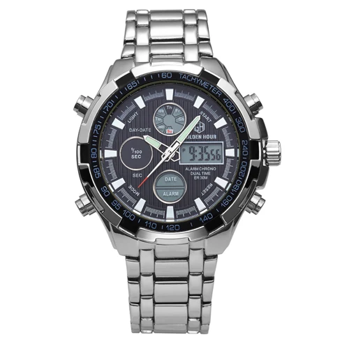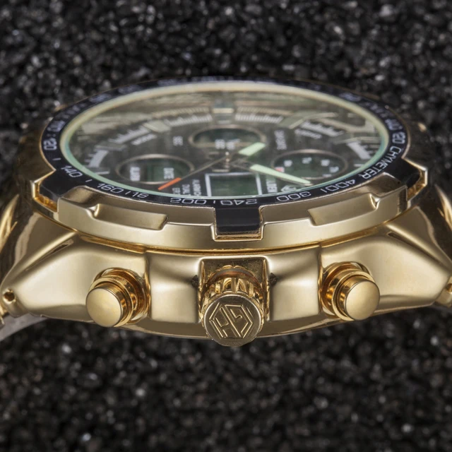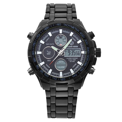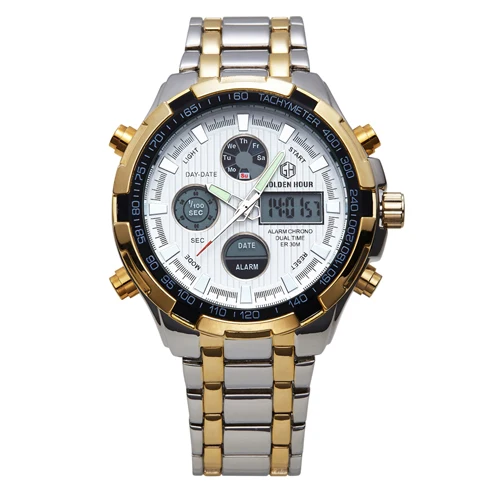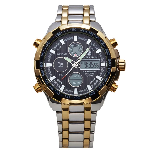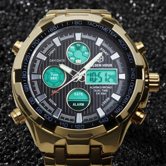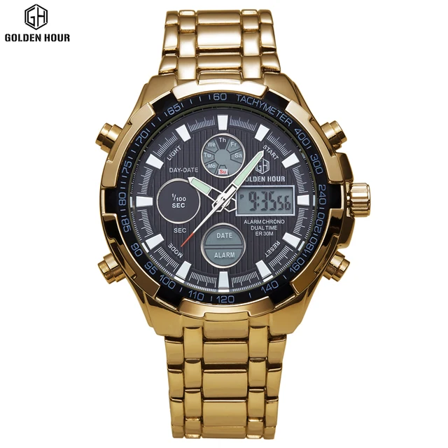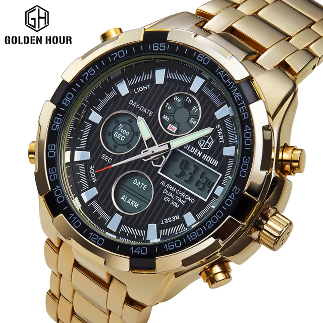 | [해외] 전체 스틸 골드 도금 시계 남성 군사 스포츠 듀얼 디스플레이 손목 디지털 24 시간 시계 남성 Relogio Masculino |