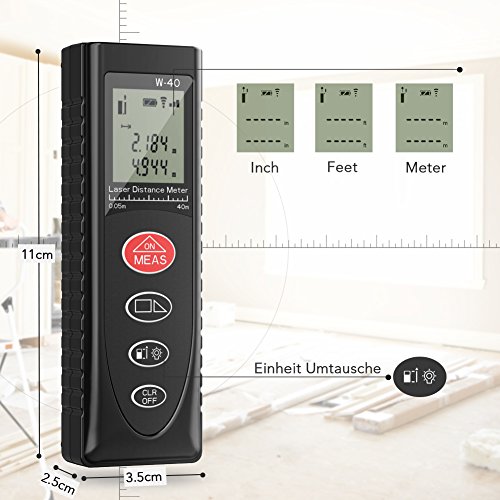 - ♪ High Accuracy: Measuring range ups to 131 feet to meet your regular measuring need; Accuracy: ±1.5mm 1/16", and press button of Units to switch unit among M/In/Ft freely while using the long distance laser measure.