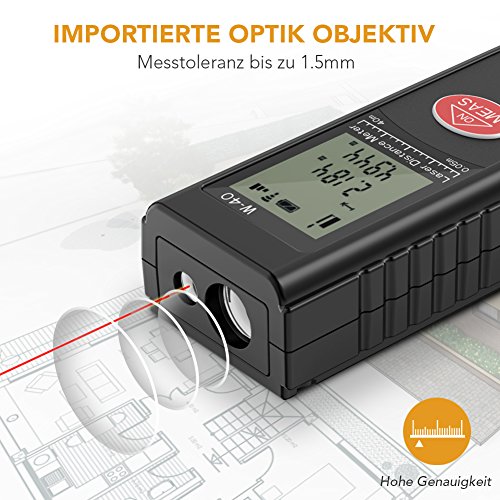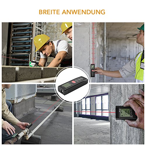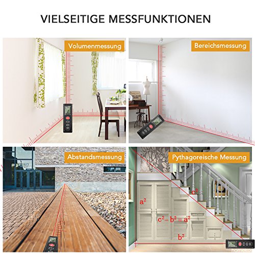 - ♪ Multi-purpose Measurements: Distance, Area, Volume measurement, and you can also have the Pythagoras function for remote measuring of height or length. The laser range finder is ideal for home, construction and industries, especially in large areas such as rooms, apartments, buildings, real estates, factories, warehouses, etc.