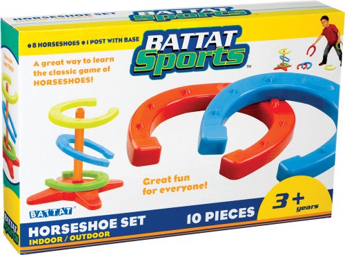 Product Description The Battat Horseshoe Set is the perfect beginner horseshoe set. Includes 8, 6.5" horseshoes in four colors, 9" post with base and game rules. Great for indoor or outdoor use. 0