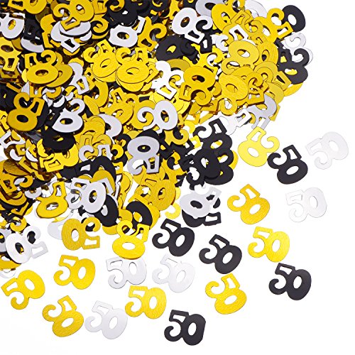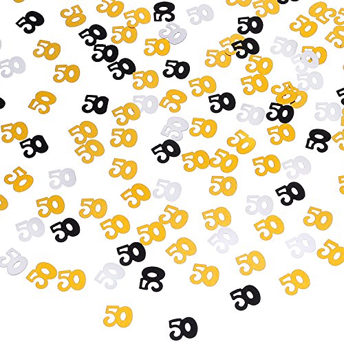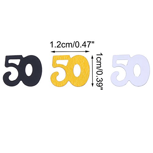 Assorted color: The 50 table confetti are mixed in 3 different colors, silver, gold and black, which adds special atmosphere and different visual enjoyment for your special activities. Feature: The table confetti design feature the number 50, suitable for decorating your 50th birthday party or 50th wedding anniversary. Usage: There are approx. 1700 pieces confetti, enough for a small party decoration; You can apply them widely for table confetti, party toss, decorating birthday invitation card, party bag filler and so on. Warm notice: Please keep the item away from children to avoid choking. Specification: Color: gold, silver, black Size: 1 x 1.2 cm/ 0.39 x 0.47 inches Weight: 1.7 ounces/ 50 g Package contents: 1 x Bag table confetti 0