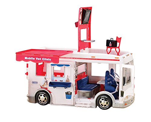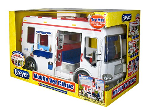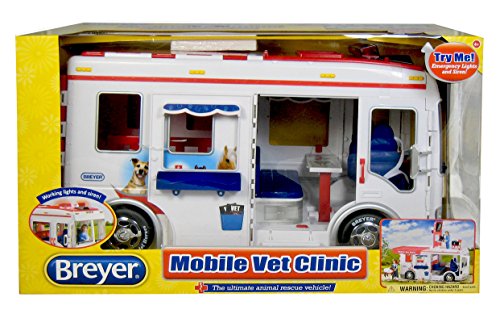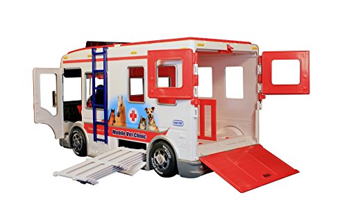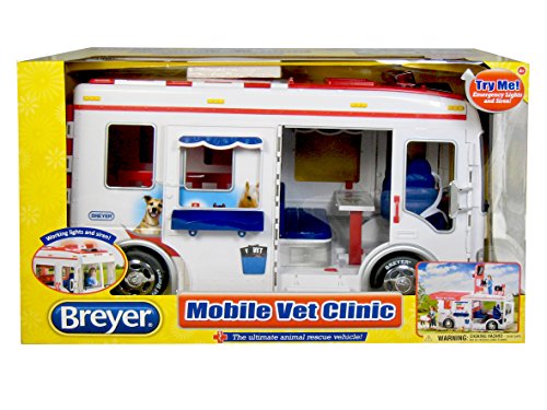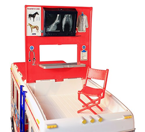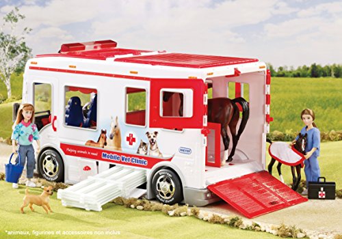 The Classics Mobile Vet Clinic is packed with fun features for hours of imaginative play: • Working lights and siren • Driver’s area features a sliding steering wheel, visors to block the sun, GPS, pull-down steps and adjustable side mirrors • The two front bucket seats with seatbelts fit 6” dolls, swivel in two directions and have storage pouches • The interior compartment has a rear seat that converts to a bed, and a pop-up examination table • Roof doubles as a mobile office with x-ray screen and fold-out table, and has a compartment to store the included ladder and chair • The trailer’s side storage bin contains eight pieces of fencing to build a corral. • Trailer features two horse stalls and working wheels, ramp, and doors. • A convenient storage compartment is under the floor of the horse stalls. • Fold-out side awning • License plate has three positionsFeature