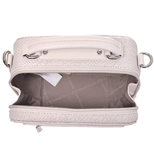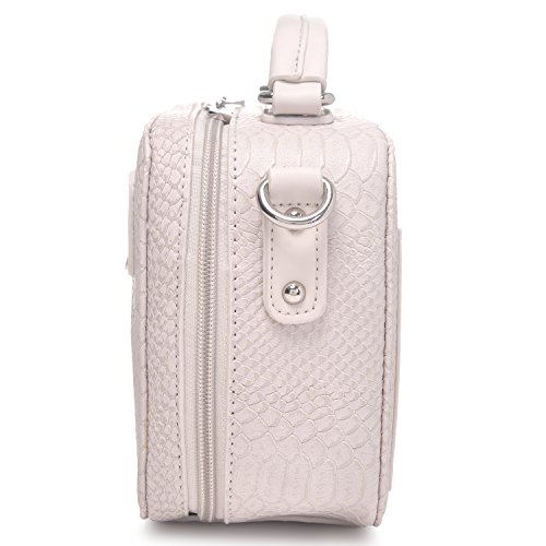 TONS OF STORAGE COMPARTEMENTS in a compact size:1 top zippered main pocket and 1 zip in front which decent this box bag;1 slip on back for easy access;1 ID window slip and 1 zippered slip inside for security essentials;enough room for your cell phone, wallet, makeup,tablets and toiletries;