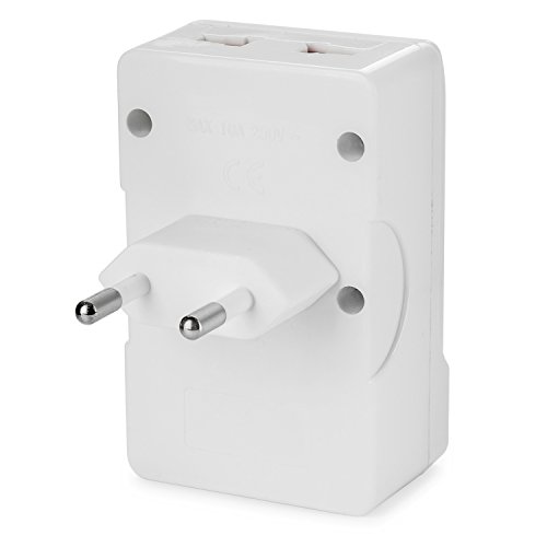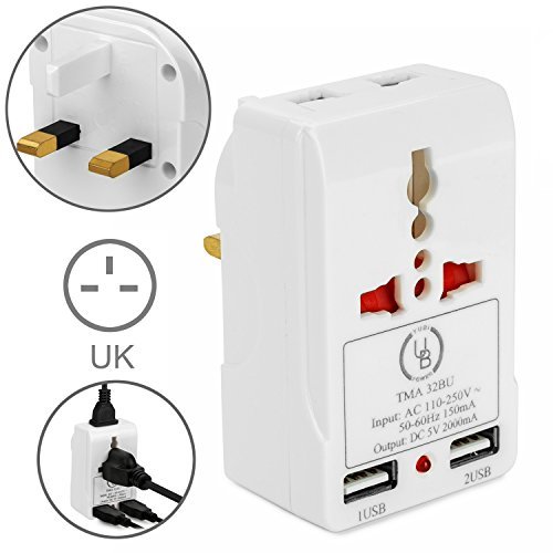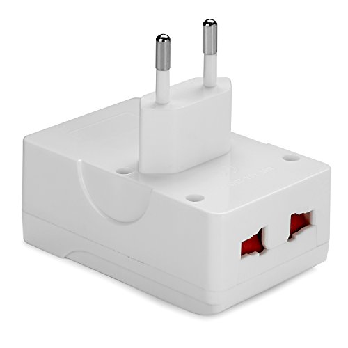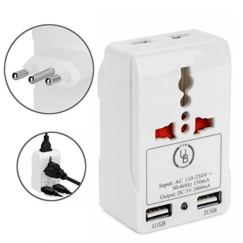 Perfect travel adapter with 2 universal outlets (2 prong and 3 prong) and a 2.0 USB charging ports