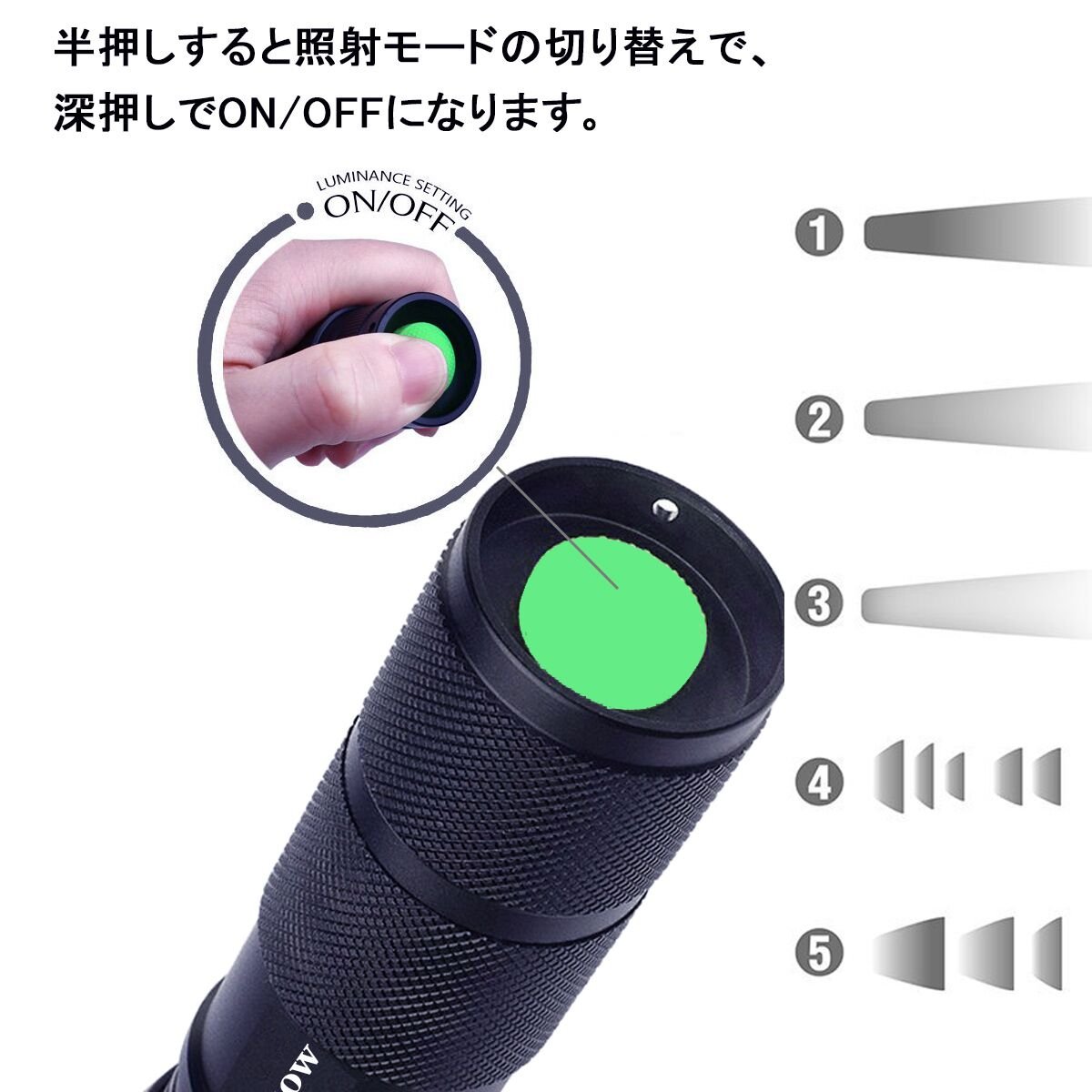In the ON state, when lightly pushing the switch, you can switch in order of strong → medium → weak → flashing → SOS.