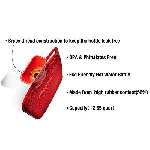 ECO-FRIENDLY, NO BPAs or Phthalates. We had this bottle officially UL Tested. The results were so impressive we posted the UL Test in our photos for your examination. You can use this bottle without fear of allergies.EXTRA LARGE SIZE makes this BIG Hot Water Bottle perfect for setting on aching tummys, on sore backs or any other parts of your body that need a comforting, healing sensation.