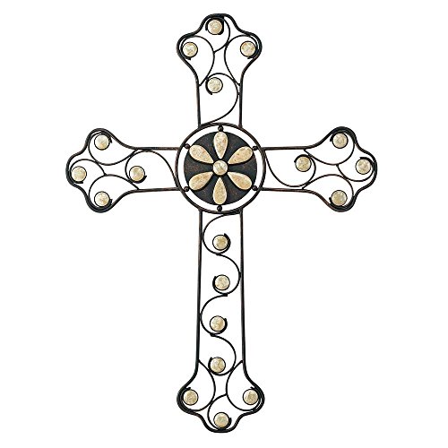 Filigree Floral Antiqued Brown Beige Stones 23 Inch Metal Hanging Wall Cross